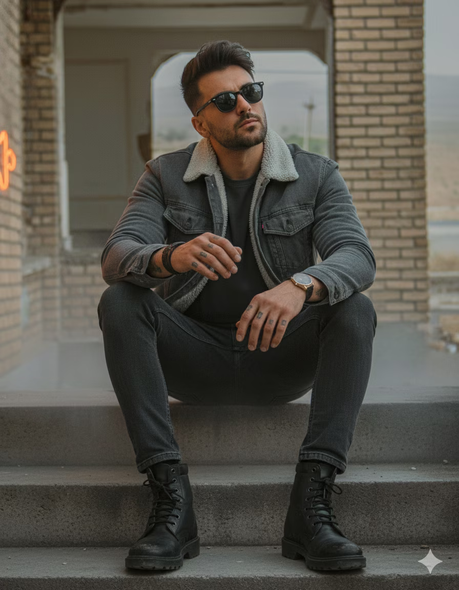 edit this image — transform the current shot into a high-contrast cinematic editorial of a young urban rebel while keeping the original pose and composition. Keep him seated center-frame on the concrete steps (legs apart, elbows resting on knees, hands reaching slightly forward toward camera, head tilted just a little to the right). Preserve his sunglasses, tousled hair and light stubble. Wardrobe & accessories: keep the grey shearling denim jacket and charcoal tee but deepen textures and fabric detail; slightly darken and desaturate the jeans to charcoal; emphasize worn black combat boots. Add subtle leather wrist cuff and a minimal gold watch on one wrist; enhance visible hand/forearm tattoos (increase clarity and tonal separation). Lighting & color: cinematic teal-orange grade — warm rim light from the left, cool shadow fill on the right; punchy midtone contrast, gentle vignette to focus on subject. Camera & detail: emulate 50mm f/1.8 shallow DOF, tight vertical crop, skin slightly retouched but natural (retain stubble and texture), sharpen eyes/reflections behind sunglasses and jacket collars, increase micro-contrast on jacket and tattoos. Add light film grain and subtle chromatic aberration for realism. Background & atmosphere: preserve blurred stair repetition but desaturate it to emphasize subject; add a faint orange neon graffiti glow on the left rail and a whisper of street mist at the lower steps for mood. Output spec: photorealistic, high detail, vertical 4K editorial crop. Position (short): seated on stairs, leaning forward, elbows on knees, hands forward, head slightly tilted right.