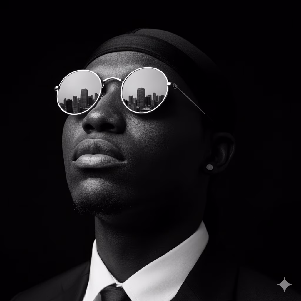 Dramatic, ultra-realistic close-up in black and white with high-contrast cinematic lighting from the side, highlighting the contours of his face and beard, casting deep shadows. He wears round, reflective sunglasses. He gazes confidently upward into a dark void. The sunglasses reflect a city's towering skyline. The atmosphere is mysterious with a minimalist black background. Details in 4K. Keep the subject's exact facial structure, hair texture, the original photo.
