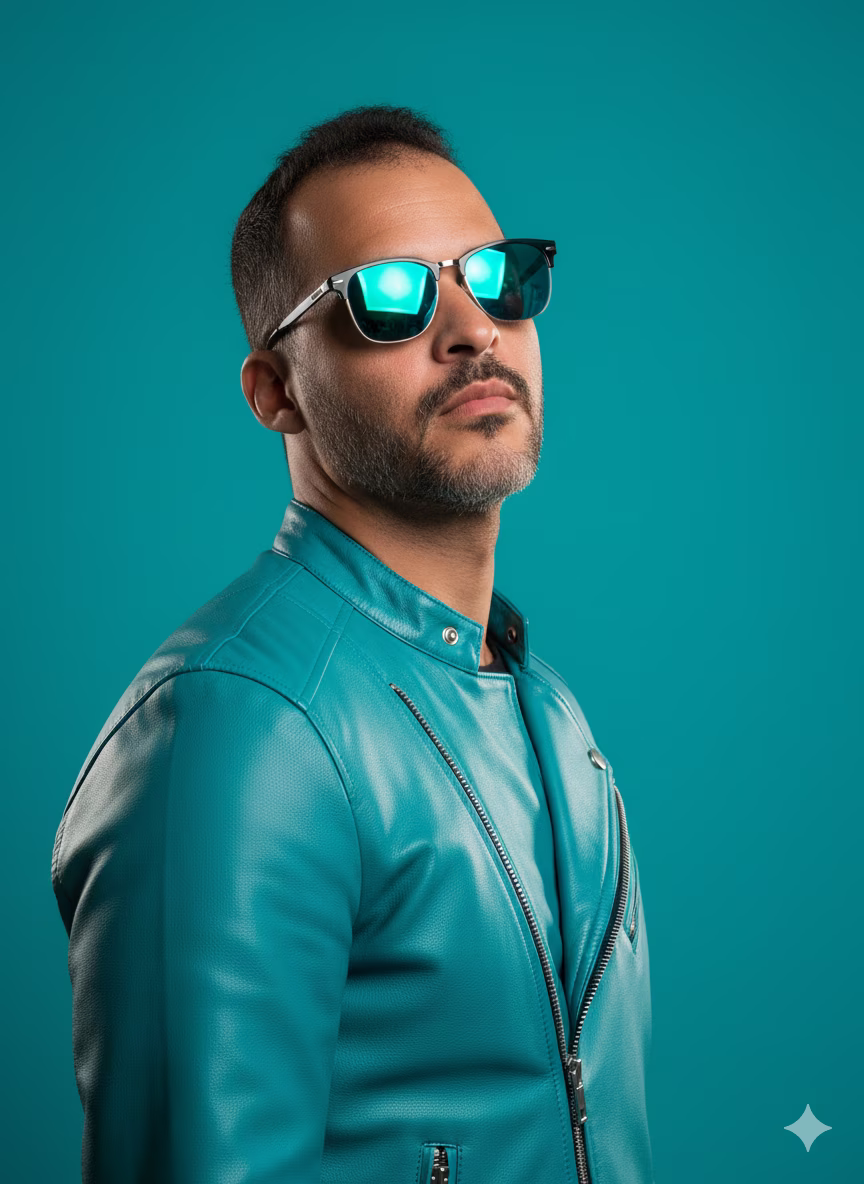 Crie uma imagem hiper-realista baseada na minha imagem de referência (Imagem 1), preservando meus traços e aparência originais, mas recriando fielmente o estilo, roupa, pose, iluminação e cenário da imagem modelo. O personagem (baseado na minha foto) aparece em plano médio, voltado levemente para a direita, com o rosto inclinado e olhar firme em direção à câmera. A expressão é confiante e neutra, transmitindo presença e estilo. Ele veste uma jaqueta de couro turquesa, moderna e ajustada, com textura realista e brilho suave típico do couro tratado. O zíper e os botões metálicos devem refletir a luz com realismo e sutileza, mantendo o aspecto de fotografia de moda profissional. Nos olhos, óculos escuros espelhados azul-petróleo, com reflexos sutis do ambiente — realçando a estética urbana. O fundo é monocromático, em tom turquesa idêntico à jaqueta, criando um visual harmonioso e de alto contraste com a pele. 💡 Iluminação de estúdio profissional: Luz principal (key light) suave e frontal, vinda levemente da esquerda, com difusor grande (softbox 120 cm). Luz secundária de preenchimento (fill light) neutra do lado direito, reduzindo sombras e mantendo textura facial. Luz de recorte (rim light) sutil no ombro e cabelo, criando separação do fundo. Temperatura de cor balanceada (5500K) — luz branca natural de estúdio. Sombras limpas e controladas, mantendo foco no rosto e na jaqueta. 📷 Câmera e Lente: Sony A7R IV, lente 85mm f/1.8, ISO 100, obturador 1/160s, abertura f/2. Foco absoluto no rosto, fundo suavemente desfocado (bokeh leve). 🎨 Color grading e estilo visual: Estilo Modern Editorial Cool Tone: Paleta dominada por tons turquesa, azul e pele quente neutra. Contraste alto e nitidez refinada, mas sem perder naturalidade. Cores vibrantes e limpas, sem granulação perceptível. Textura realista de pele e cabelo, com brilho controlado. Reflexos metálicos sutis no zíper e nos óculos. Tom visual: elegante, vibrante e urbano — como capa de revista ou campanha de moda contemporânea. Filtro: Cinematic Cool HDR, com cores saturadas e luz de estúdio limpa. Ambiente: fundo monocromático turquesa, estúdio moderno, luz balanceada. Palavras-chave visuais: --ultra realistic --studio lighting --8k --HDR contrast --photo realism --vibrant tones --depth of field --sharp focus --fashion editorial --turquoise tones --clean background --modern portrait --soft shadows --bokeh background --studio quality --skin texture detail --leather jacket 🎬 Notas do Diretor de Fotografia: A chave visual é o equilíbrio entre o turquesa saturado e a pele natural, sem que nenhuma cor domine a outra. A luz suave e frontal garante textura na pele e brilho uniforme na jaqueta. O enquadramento em plano médio com leve inclinação do rosto transmite carisma e estilo. O resultado deve parecer uma foto de revista de moda internacional (GQ, Vogue Men, Balmain Campaign) — idêntica em cor, luz e composição à original, mas com você como protagonista.