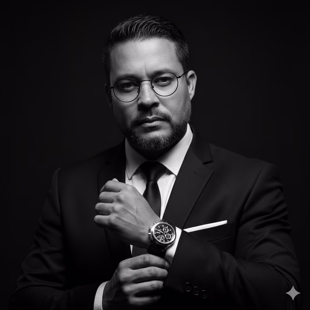 Uma fotografia de close-up e médio-busto, capturando uma figura masculina com uma presença imponente e carismática. O sujeito está voltado ligeirament...