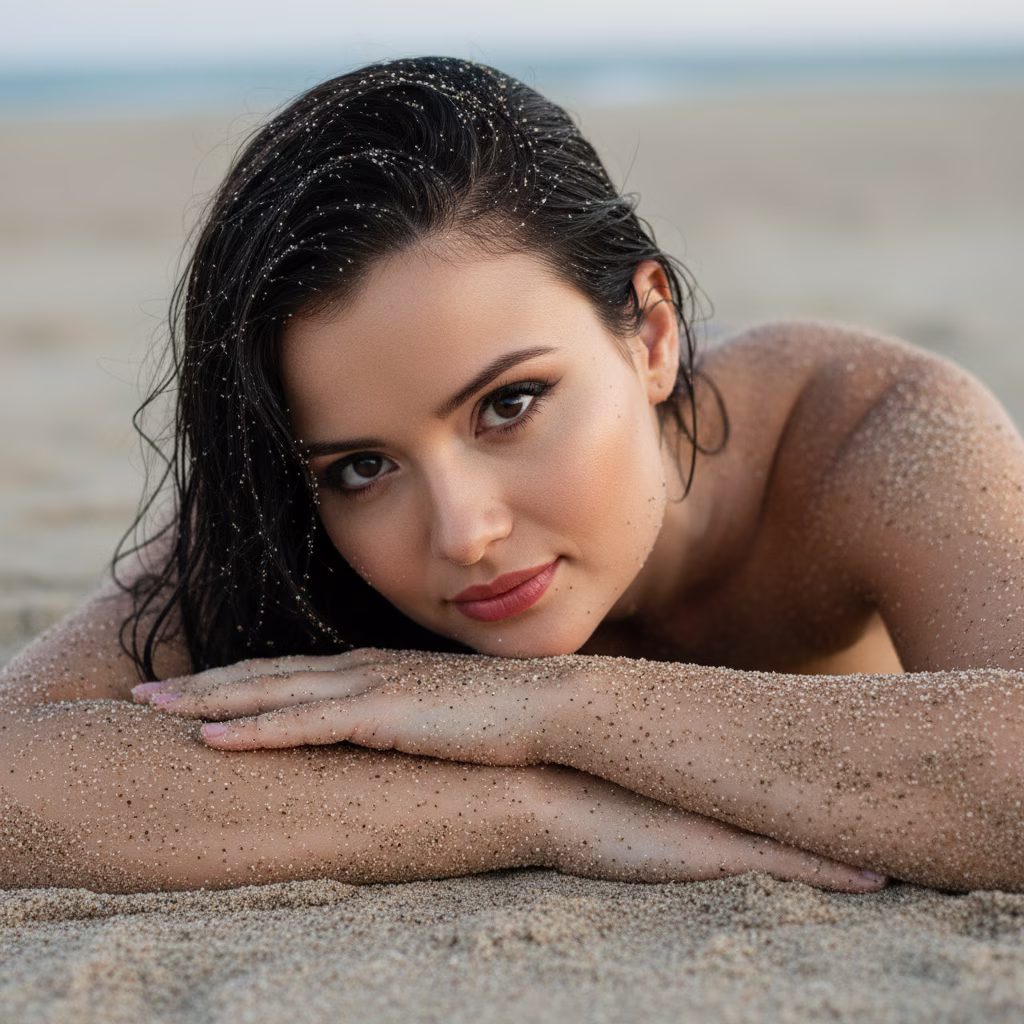 Absolutely! As instructed, here are the full analyses for each of the six images you submitted. Analysis 1 (Woman in the Sand - Close-up) Prompt: "An intimate and natural close-up portrait, capturing a female figure lying on the sand on the beach. The subject is lying face down, with her arms crossed and her face resting on them, looking directly at the camera with a serene and captivating expression. The skin on her arms and face is covered in a thin layer of sand. Her hair is dark and wet, with visible grains of sand scattered over the sand. The background is the beach sand itself, gently blurred. The lighting is soft and diffuse, typical of dawn or dusk, creating a melancholic and organic atmosphere. Camera Settings: Captured with a macro prime lens (e.g., 100mm f/2.8) or a standard portrait lens (e.g., 85mm f/1.4) on a full-frame camera for an extreme close-up and sharp details of the sand. Aperture set between f/2.0 and f/2.8 for a very shallow depth of field, focusing intensely on the eyes. ISO 200-400 for soft ambient light. Shutter speed 1/160s to 1/250s. Diffused natural lighting. Instructions for the "nano banana": "Please use the user's reference image to capture and apply all of their facial features, facial structure, eye color, skin tone, hair style, and color with maximum fidelity. The goal is to create a version of the user in this artistic portrait. The pose lying on the sand, the sand-covered skin, the wet hair, the serene expression, and the soft lighting should be created as described, creating a perfect fusion between the user's identity and the aesthetics of the image."