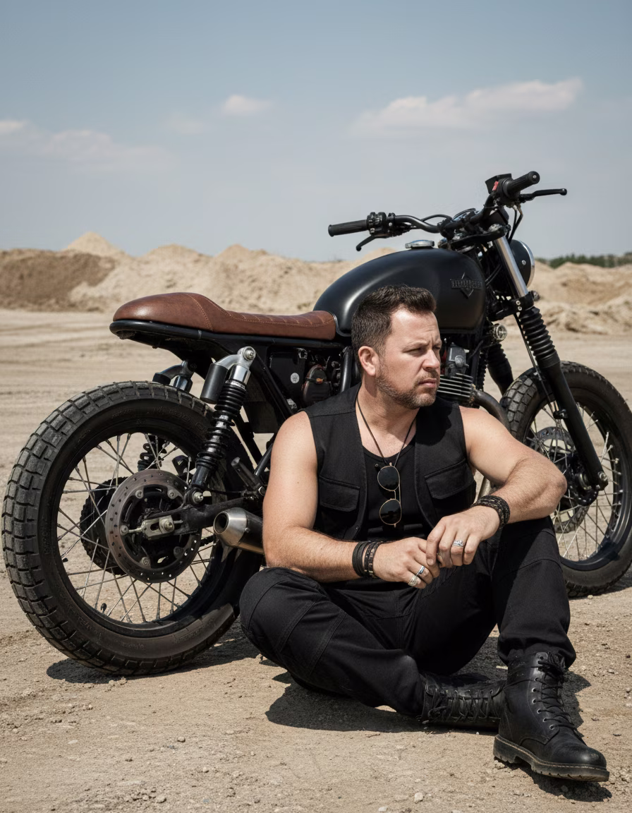 A fashion and lifestyle photograph with a rugged, adventurous aesthetic, capturing a male figure sitting casually next to a customized motorcycle. The subject is seated on the ground, leaning against the bike's rear wheel, with his legs extended and arms relaxed. His gaze is directed to the side, out of the frame, conveying a pensive and adventurous expression. His hands are slightly clasped or holding rings. He wears a monochromatic, utilitarian ensemble in dark tones: a black tank top, a black sleeveless jacket (vest), and cargo pants or dark, rugged jeans. A pair of vintage aviator sunglasses hangs around his neck. Multiple rings and leather bracelets adorn his hands and wrists, adding an edgy touch. On his feet are dark military-style or motorcycle boots. His hair is dark and styled with texture and a slight quiff, complemented by a short, well-groomed beard. The motorcycle is a matte black custom bike with a brown leather seat, chunky tires, and exposed metal details, reflecting a cafe racer or scrambler style. The background is an arid and desolate environment, like a field with piles of sand or dirt, under a clear, slightly cloudy sky, conveying a sense of vastness. The lighting is natural and diffuse, typical of a clear day outdoors, creating soft shadows that highlight the textures of the clothing, the motorcycle, and the terrain, and sculpt the body. Camera Settings: Captured with a standard lens (e.g., 50mm) or slightly wide-angle (e.g., 35mm) on a full-frame camera for a wide perspective that includes the subject and the motorcycle in the environment. Aperture set between f/4.0 and f/5.6 to ensure sharpness across the subject and motorcycle. ISO 100-200 for maximum image quality in abundant natural light. Shutter speeds of 1/250s to 1/500s ensure sharpness. Lighting is exclusively natural, taking advantage of ambient light. Instructions for the "nano banana": "Please use the user's reference image to capture and apply all of their facial features, facial structure, hair and beard style, eye color, and skin tone with maximum fidelity. The goal is to create a version of the user in this scenario. The clothing (black tank top, vest, dark pants, aviator sunglasses, rings, bracelets, boots), the customized motorcycle, the pose sitting on the ground next to the motorcycle, the pensive expression, the natural lighting, and the sandy terrain background should be generated as described, creating a perfect fusion between the user's identity and the aesthetics of the image."