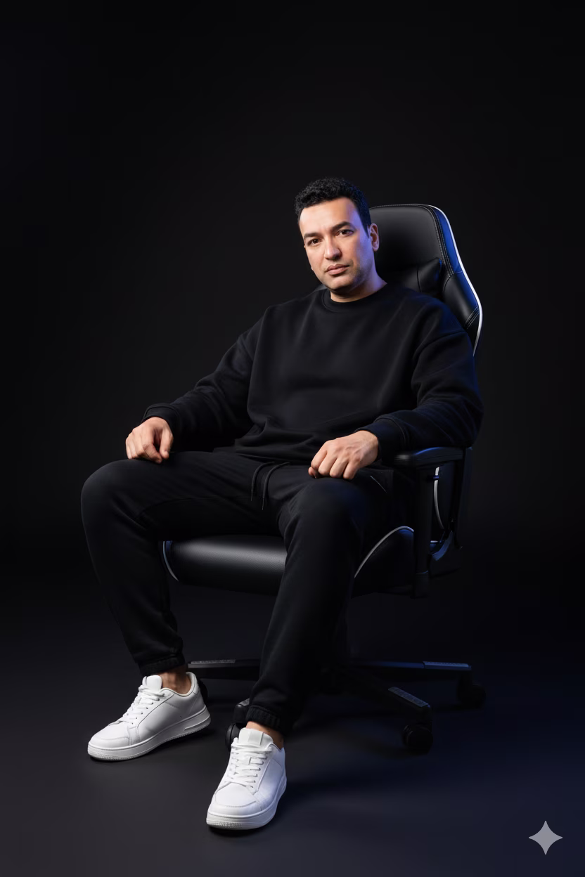 Modelo masculino em um retrato ultra-realista em 8k,vestindo um moletom oversized preto e calças de moletom pretas,combinados com tênis brancos.O modelo está sentado elegantemente em uma cadeira gamer preta com iluminação LED,em um estúdio minimalista com fundo preto e uma luz suave e cinematográfica que destaca as texturas.O estilo é futurista e editorial,com o modelo em uma pose de moda,com a cabeça levemente inclinada.O rosto é consistente com o da foto fornecida.