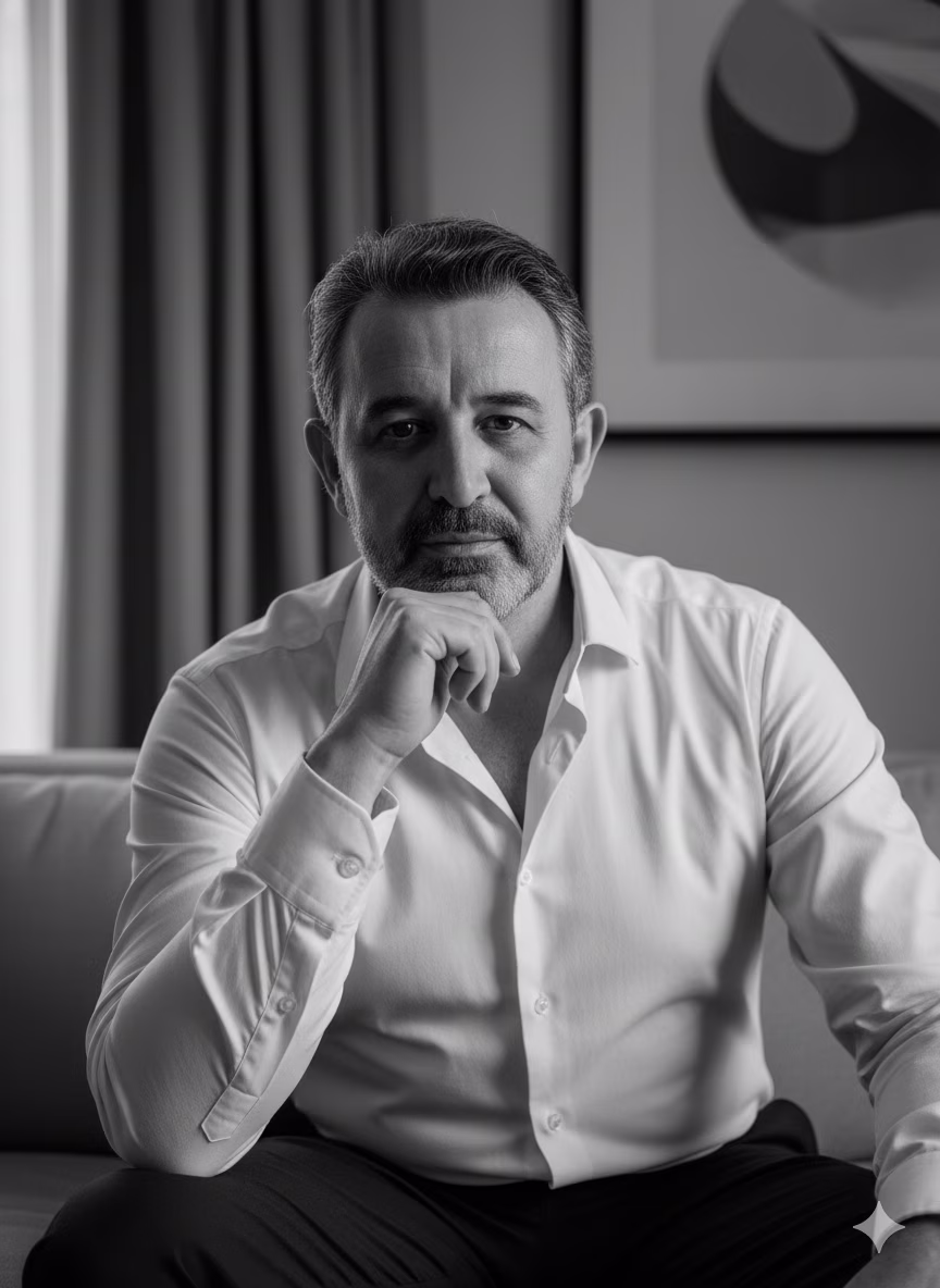 Prompt principal (positivos): Retrato masculino em preto e branco, estilo editorial de revista, foco em um homem sentado em um sofá, expressão confiante e introspectiva, olhar direto para a câmera, pose relaxada com a mão apoiando o queixo, camisa social clara com alguns botões abertos, barba bem aparada e cabelo penteado para trás com volume natural, iluminação suave vinda da lateral criando contraste e profundidade, ambiente sofisticado com cortinas e decoração moderna ao fundo, textura realista da pele e do tecido, nitidez alta, qualidade fotográfica profissional, lente 85mm f/1.8, estilo monocromático cinematográfico. Detalhes técnicos (para controle de qualidade): Estilo fotográfico: retrato editorial em preto e branco Enquadramento: close médio (do peito até o topo da cabeça) Iluminação: luz lateral suave com sombras bem definidas Ambiente: interior elegante, tons neutros e textura de cortina ao fundo Expressão: neutra, confiante, levemente pensativa Roupa: camisa de algodão clara, casual, botões abertos no colarinho Cabelo e barba: penteado natural, barba curta e alinhada Tom geral: sofisticado, artístico, masculino Parâmetros opcionais (para ajustes finos no Nano Banana): --style: cinematic_bw --focus: face --lighting: soft_side --pose: hand_on_chin --mood: confident_relaxed --camera: 85mm_f1.8 --quality: ultra_detail Prompt negativo (para evitar problemas): blurry, cartoonish, oversaturated, smiling, colored image, low contrast, low detail, harsh lighting, distorted proportions, unrealistic texture, cluttered background