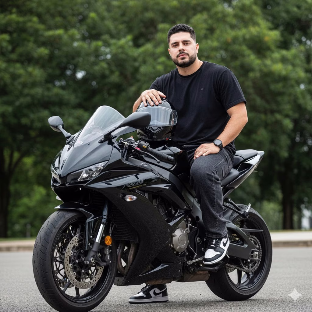Crie uma imagem minha [foto enviada em anexo] um retrato ultra-realista. Eu estou sentado em uma Moto esportiva preta brilhante em uma área ao ar livre contra o fundo de árvores verdes. Eu uso uma camiseta preta solta, jeans escuros soltos com dobras na parte inferior e tênis Nike preto e branco. Os acessórios usados incluem um relógio preto. Minha mão esquerda descansou casualmente em sua coxa, enquanto sua mão direita descansou na moto enquanto segurava um capacete preto brilhante com uma viseira transparente. A moto parece detalhada com um motor grande, quadro forte e detalhes cromados brilhantes, acentuando a impressão moderna e poderosa. O fundo mostra árvores altas com luz natural suave, criando uma mistura equilibrada de sombra e luz. A expressão é calma e confiante, olhando diretamente para a câmera. O estilo geral é cinematográfico e moderno, combinando a sensação de streetwear jovem com a presença de uma motocicleta arrojada. Alta resolução, estilo editorial fotorrealista.