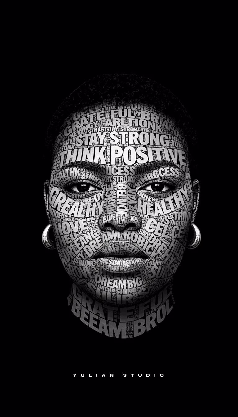 Create a hyper-detailed black and white portrait artwork where the face is formed entirely from motivational and positive words in bold typography. The words should follow the contours, shadows, and highlights of the uploaded reference face, making the facial features 99.99% identical to the reference photo. Only show the face, clothing is not needed. Use a dark background so the face stands out, with words such as 'GRATEFUL', 'STAY STRONG', 'THINK POSITIVE', 'HEALTHY', 'HARD and other positive English words clearly visible and integrated into the face structure. Artistic, powerful, inspirational, and realistic typographic portrait style
