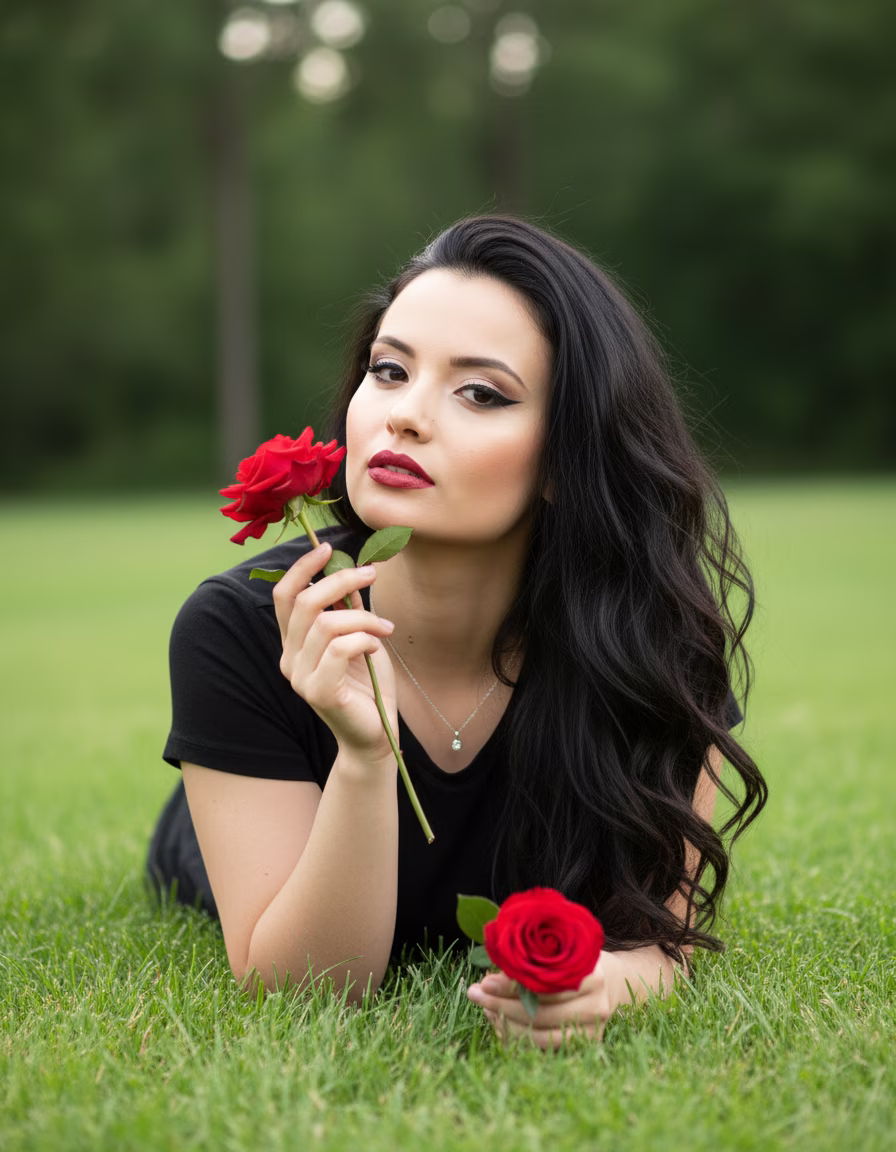 A romantic and dreamy portrait, captured outdoors, shows a female figure lying on the grass. The subject is propped up on her elbows, her body slightly raised, and looks directly at the camera with a seductive and confident expression. One hand holds a vibrant red rose close to her face, as if inhaling its scent, while the other rests on the grass, holding another rose. She wears a simple black T-shirt, which creates a strong contrast with her skin and the red roses. A delicate necklace is visible around her neck. Her hair is long, dark, and voluminous, with lush waves falling over one shoulder. Her makeup is dramatic, with a well-defined cat-eye, long lashes, and lips painted a red or wine hue that complements the roses. The background is a green lawn with a softly blurred grove or trees, bathed in soft light. The lighting is natural and diffuse, creating a soft glow on her skin and hair, and highlighting the vibrant colors of the flowers. Camera Settings: Captured with a prime portrait lens (e.g., 85mm f/1.8 or 50mm f/1.4) on a full-frame camera for creamy bokeh and flattering compression. Aperture set between f/1.8 and f/2.8 to isolate the subject from the background with a shallow depth of field. ISO 100-200 for maximum image quality in natural light. Shutter speed 1/250s to 1/500s. Soft, natural lighting, possibly late afternoon or on a cloudy day. Instructions for the "nano banana": "Please use the user's reference image to capture and apply all of their facial features, facial structure, eye color, skin tone, style, and hair color with maximum fidelity. The goal is to create a version of the user in this romantic portrait. The clothing (black t-shirt), red roses, dramatic makeup, lying-on-the-grass pose, natural lighting, and grassy background must be generated as described, creating a perfect fusion between the user's identity and the aesthetics of the image."
