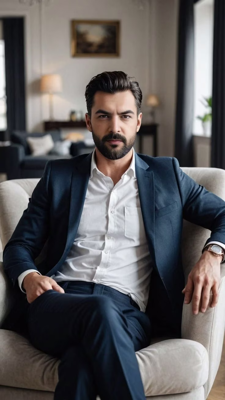 Portrait of a confident man sitting on a beige armchair in an elegant living room. He wears a dark navy blue suit with a white dress shirt, no tie. His hair is dark brown, neatly styled back, and he has a short full beard and fair skin. He sits with his right leg crossed over his left, left arm resting on the chair arm, right hand on his leg, looking directly at the camera with a serious and confident expression. The background shows a sophisticated room with soft warm lighting, blurred lamps, curtains, and framed artwork. The lighting is natural and soft, cinematic, emphasizing texture and detail. Vertical framing, 85mm lens, f/2.8, ultra-realistic corporate editorial portrait. the subject from the uploaded image, maintaining the exact real face, hairstyle, skin tone, and body identity unchanged.