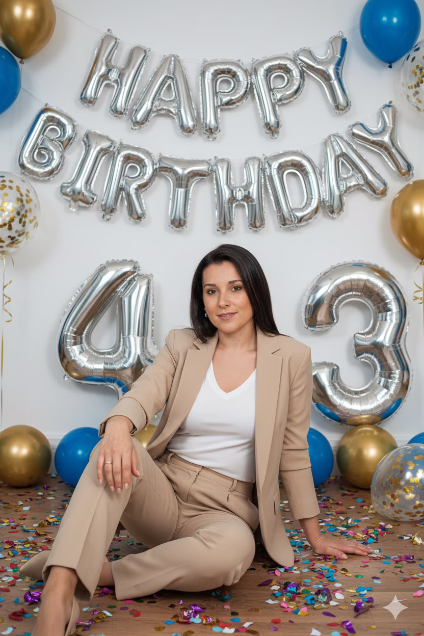 --preserve_identity=100% --no_stylization --no_feature_blending. Sujeto basado en la imagen de referencia. Rasgos faciales exactos; Estilo editorial de alta moda, 8K; Mujer idéntica al rostro de referencia, sentado en el piso frente a globos de cumpleaños y confeti, vistiendo traje beige al cuerpo, resaltando su figura y una camiseta blanca ajustada cuello V; fondo decorado con globos metálicos y “HAPPY BIRTHDAY 43”; Luz brillante de estudio, contraste medio, atmósfera divertida; -- ar 9:16 vertical, 8K RAW, lente 35-85mm f/1.2-f/2.8, ISO 100-400, enfoque nítido en rostro/ojos, profundidad de campo reducida, bokeh suave, HDR, iluminación cinematográfica, gradación cálida/natural, grano de película sutil, texturas hiperrealistas de piel, ropa y accesorios, fondo suavemente desenfocado, nitidez editorial, estilo editorial/alta moda. -- sin CGI, 3D, render, caricatura, anime; sin piel de plástico, borroso, artefactos, distorsiones, poses rígidas; evitar saturación o colores irreales, sobreexposición, reflejos falsos; no alterar rostro, expresión, cuerpo ni identidad; mantener realismo y estilo cinematográfico/editorial.