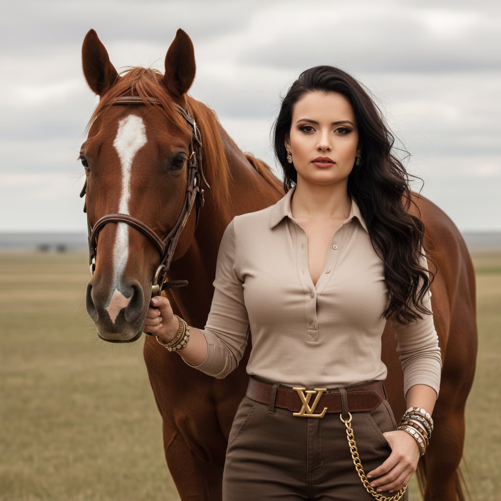 A cinematic, mid-length portrait, capturing a female figure with a strong and elegant presence, standing next to a horse. The subject faces the camera, with a direct and confident gaze. One hand gently holds the horse's halter or head, conveying a calm and powerful connection with the animal. She wears a long-sleeved shirt in a neutral tone (beige, khaki, or light gray), with the top buttons undone to create a V-neckline. The bottoms are earthy-colored pants (brown or khaki), complemented by a brown leather belt with a large, prominent gold buckle (possibly with the letter 'V'). A gold chain hangs from the belt loops, adding a touch of glamour. The look is adorned with multiple bracelets on both wrists, combining metals and natural materials. Her hair is long, with voluminous waves and a natural look, as if gently blown by the wind, framing her face. The makeup is natural yet defined, enhancing the beauty of her features. Beside her, a brown horse with a white marking on its face looks forward, in harmony with the figure. The background is an open field, such as a prairie or a valley, with a cloudy sky and the landscape in the background gently blurred, creating a sense of vastness. The lighting is natural and diffuse, typical of an overcast day, resulting in soft shadows and light that flatters the face and body. Camera Settings: Captured with a prime portrait lens (e.g., 85mm f/1.8 or 105mm f/1.4) on a full-frame camera for optimal compression and creamy bokeh. Aperture set between f/2.0 and f/2.8 to perfectly isolate the subject and horse from the background. ISO 100-200 for maximum image quality with abundant natural light. Shutter speeds of 1/400s to 1/800s ensure absolute sharpness and freeze any subtle movement of the hair or horse. The lighting is exclusively natural, taking advantage of the soft light of an overcast sky. Instructions for the "nano banana": "Please use the user's reference image to capture and apply all of their facial features, facial structure, eye color, skin tone, hair style, and color with maximum fidelity. The goal is to create a version of the user in this cinematic portrait. The clothing, accessories, the pose next to the horse, the confident expression, the diffuse natural lighting, and the open field setting should be rendered as described, creating a perfect fusion between the user's identity and the aesthetics of the image."