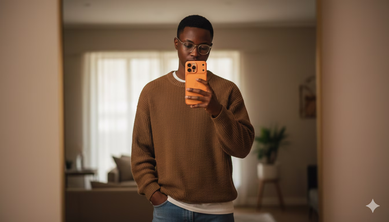 Ultra-realistic mirror selfie of a me (uploaded pic)with glasses. He is wearing a loose brown sweater layered over a crisp white T-shirt, paired with blue jeans. A silver chain necklace adds a subtle accessory touch. He holds a new modern iPhone 17 smartphone orange colour in one hand, partially covering his face, while his other hand rests casually in his pocket. The scene is set in warm indoor lighting, creating a cinematic, moody atmosphere with soft shadow
