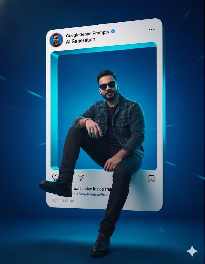 A hyper-realistic portrait of the uploaded young man inside a giant Instagram post frame that dominates the scene. His face remains same, sharp and untouched, wearing dark sunglasses and sleek shoes, exuding bold charisma. His relaxed pose shows his right elbow resting on his knee, left arm casual, and one leg stepping out of the Instagram frame in a 3D illusion. The Instagram frame is highly realistic with username GoogleGeminiPrompts, verified checkmark, display name "Al Generation", caption: "Too real to stay inside frame #AlCreation #GoogleGeminiPrompts", and authentic icons. The background is designed for masculine boldness: deep cobalt blue blending into cyan, with subtle light streaks adding energy, Clean, cinematic lighting highlights his clothing textures and the 3D illusion, making him the viral centerpiece.